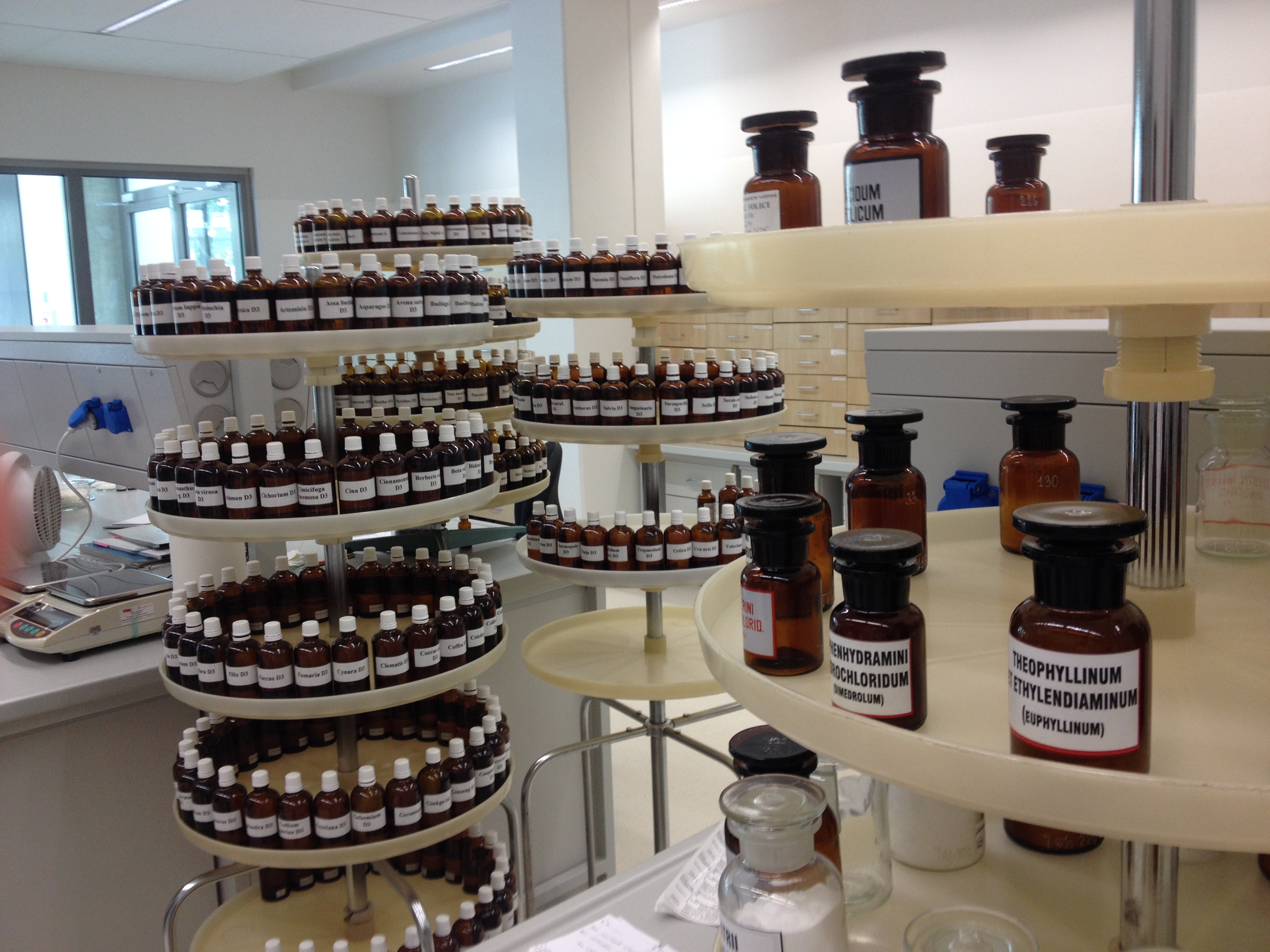 Vials on display, filled with different chemicals/medications in the community pharmacy