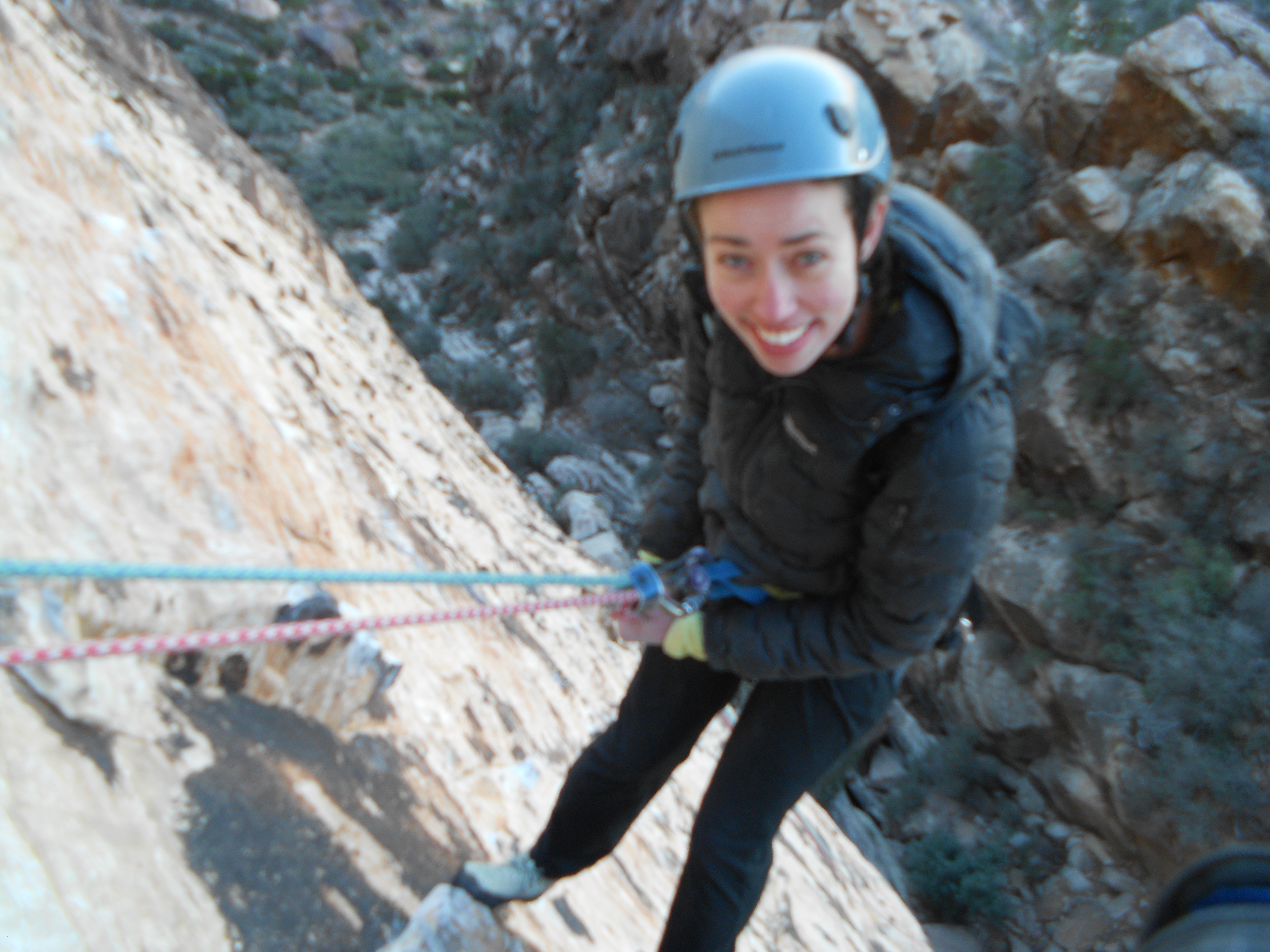 Tuesday: We had a party of 3 this day, which makes climbing multi-pitch routes difficult, so we had aimed to set out for the Black Corridor for sport routes. However, we accidentally drove past the pullout – and in Red Rocks, once you are in the park, you are stuck on a 13 mile scenic overlook for 13 miles, so turning around wasn’t an option. So instead it was back to the guide book and discover new potential routes. (Luckily in Red Rocks, that isn’t hard to do!) Mans best friend, 5.7 sport, 2 pitches –Casey and I both led a pitch of it. Very easy climbing and bolted like a gym route- but still lots of fun! Then we scrambled through and above a narrow slot canyon to Hidden edge, 5.10b (actually 5.11a, but who’s keeping track?) sport. Then off to another area where I led the trad route, Spider line, 5.7 trad. I just started leading trad this summer and haven’t had too much experience since, so it was great to try it again. Let me tell you, leading trad is a whole different mind set when you have to place your own gear rather than relying on bolts! The climb can be easy, but your mind likes to induce a certain fear factor.