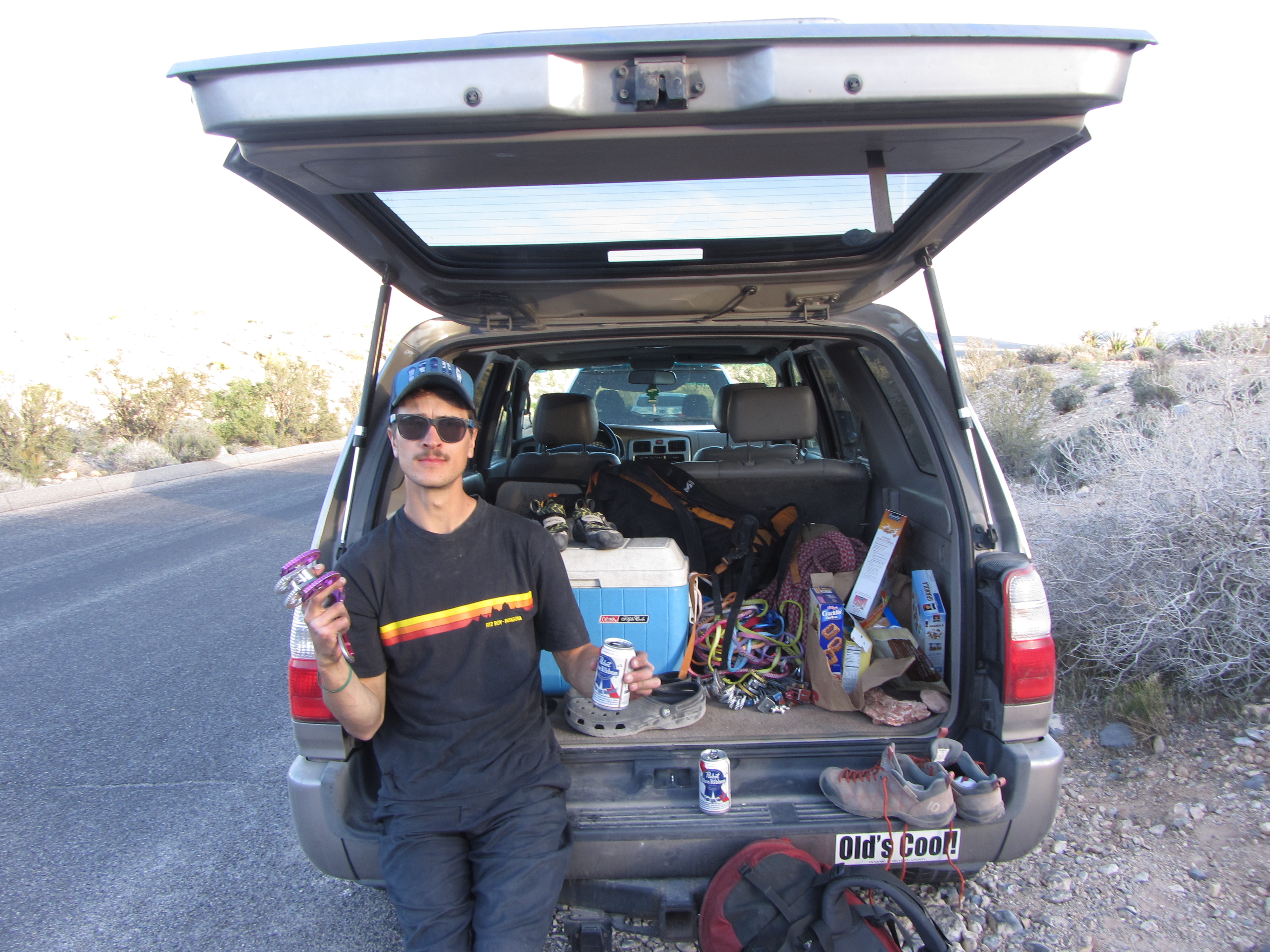Connor after a day of climbing, at the car with PBR and camelot #4 in hand.